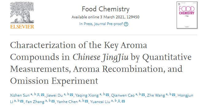 近日,國際學術(shù)期刊食品化學(Food chemistry,中科院1區(qū),影響因子為6.306)在線發(fā)表了《通過定量分析,香氣重組和缺失實驗表征中國勁酒中的關(guān)鍵香氣活性化合物》的研究文章。撰稿人正是來自勁牌研究院的風味研究小組。